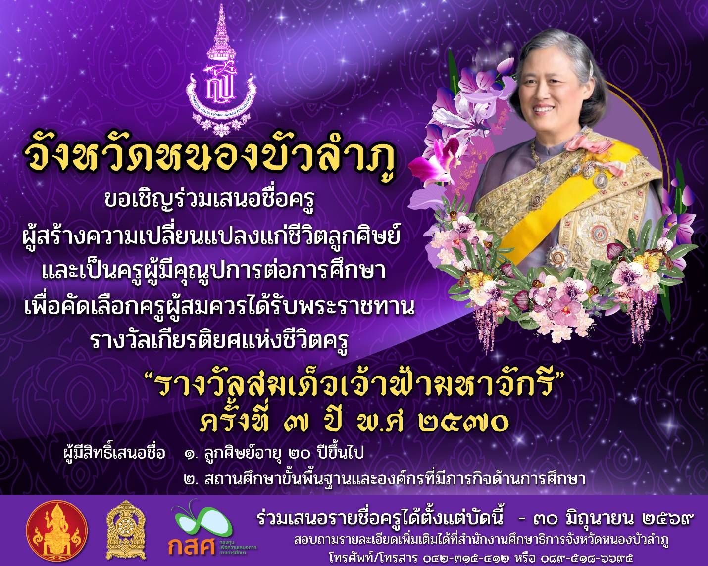 - ประกาศรายชื่อผู้สมัครเข้ารับการคัดเลือกบุคลากรดีเด่น “ครูดี ศรีชุมชน คนลุ่มภู” ประจำปีงบประมาณ พ.ศ. 2568 ของจังหวัดหนองบัวลำภู 1 สิงหาคม 2568