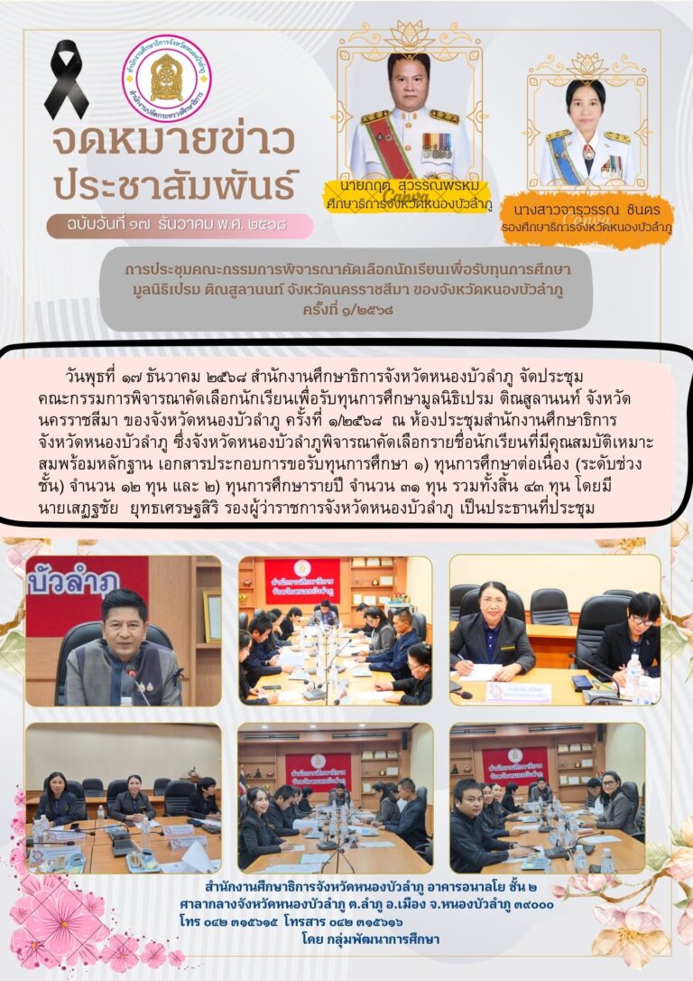 - ประกาศรายชื่อผู้ได้รับคัดเลือกเป็นบุคลากรดีเด่น “ครูดี ศรีชุมชน คนลุ่มภู” ประจำปีงบประมาณ พ.ศ. 2568 ของจังหวัดหนองบัวลำภู 22 สิงหาคม 2568